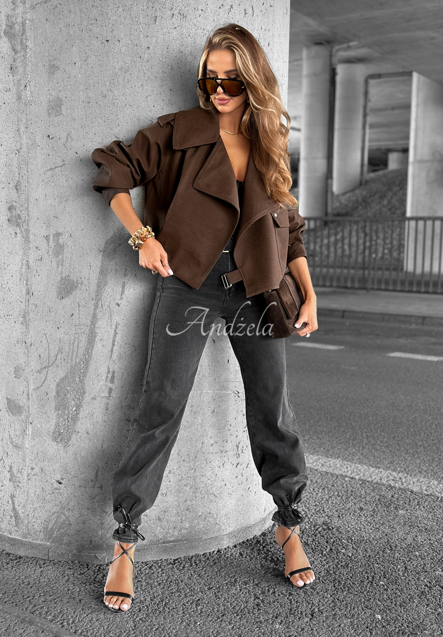 Krótka ramoneska wykonana z przyjemnej w dotyku imitacji matowej skóry. Model zapinany jest na napę, wszystkie dodatki są w srebrnym odcieniu. Posiada kołnierz, rękawy zapinane na napy, a na dole znajduje się wszyty pasek z możliwością regulacji.