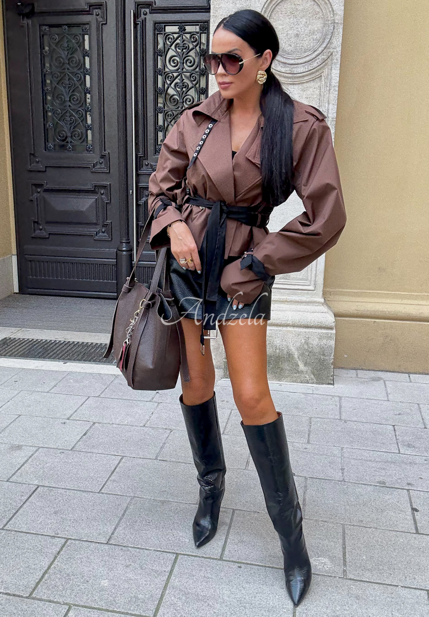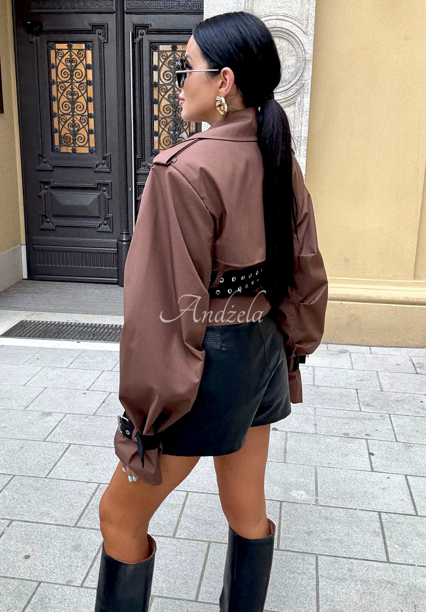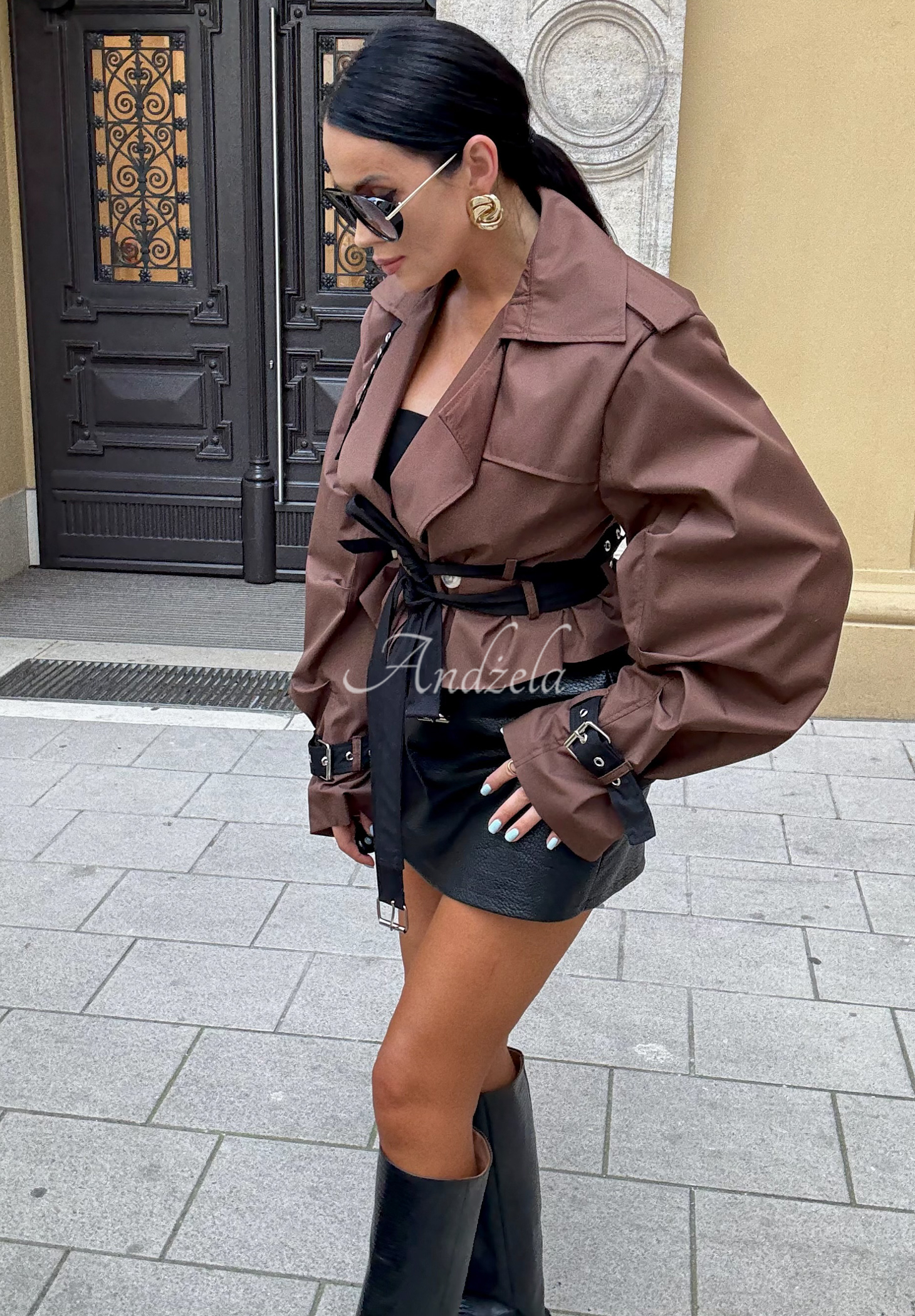 Krótki trencz to świetny wybór na sezon przejściowy. Propozycja o modnym fasonie z kołnierzem i poduszkami na ramionach, zapinana na guziki. Posiada podszewkę, a w dolnej części znajdują się materiałowe paski. Dół rękawów oraz kołnierz również zostały wykończone regulowanymi zapięciami.