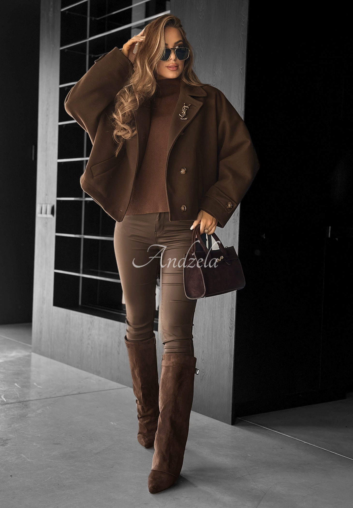 Płaszcz o krótkim, oversizowym fasonie z szerokimi rękawami. To model z kołnierzykiem i skośnym zapięciem na guziki. Z przodu znajdują się funkcjonalne kieszenie, a na rękawach ozdobne paski.