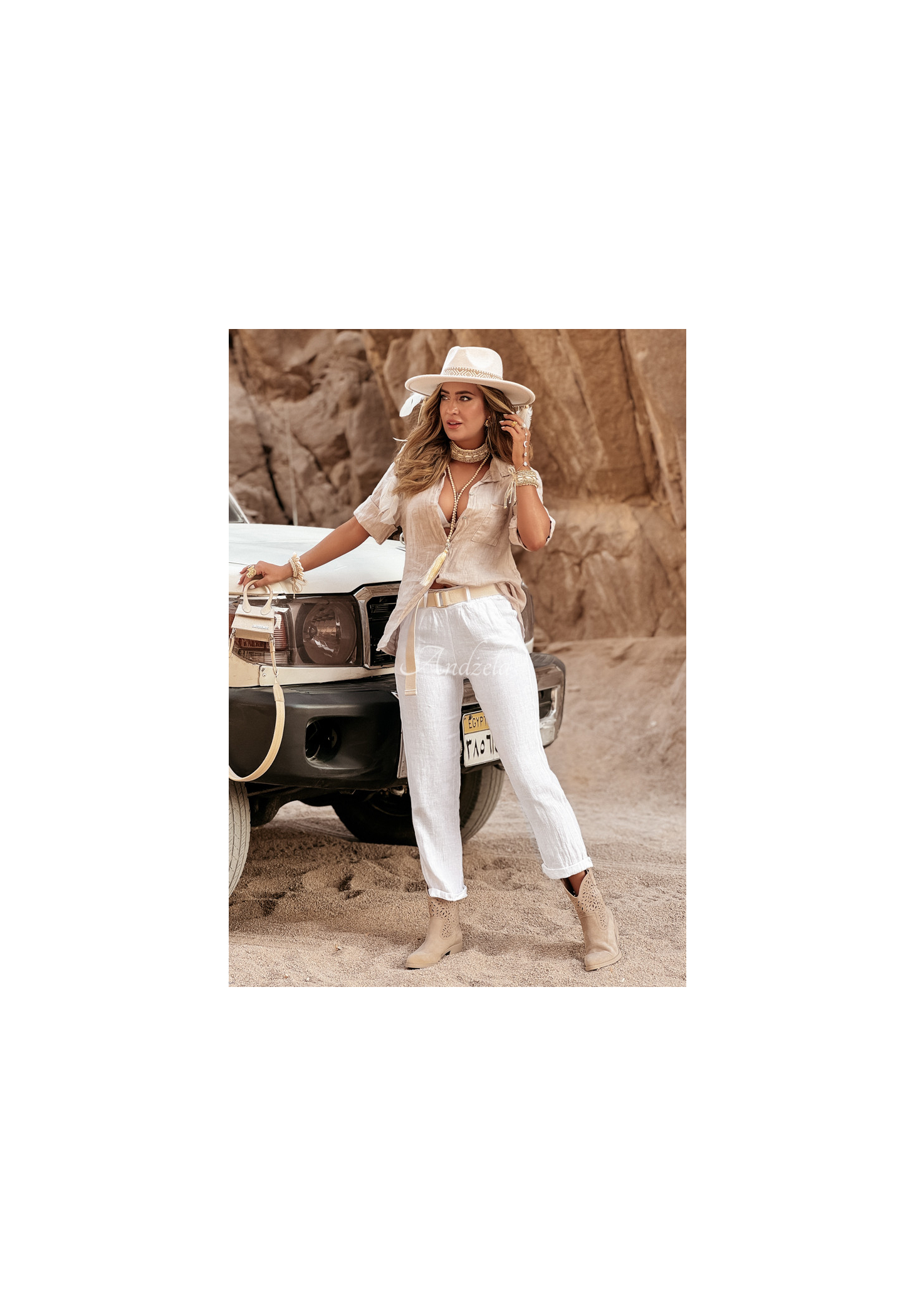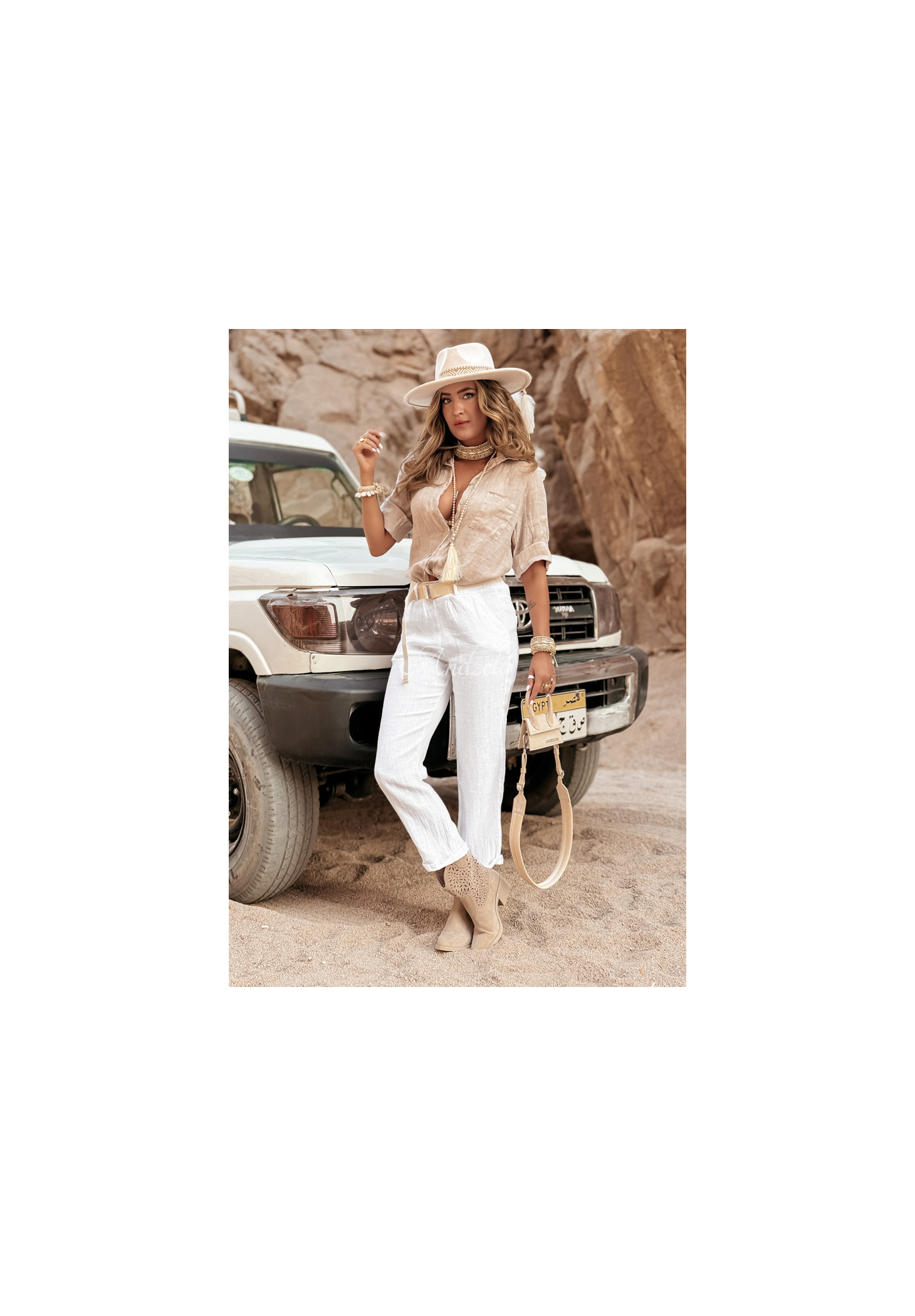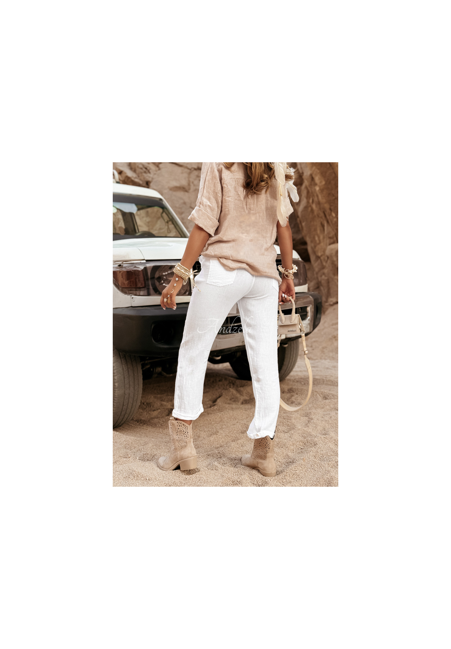 Spodnie wykonane z wysokiej jakości lnianego materiału to świetny wybór w sezonie letnim. W pasie wszyta jest gumka, dzięki której doskonale dopasują się do sylwetki, a dodatkowym atutem jest dołączony do zestawu pasek, który nadaje całości charakteru. Z przodu i z tyłu znajdują się funkcjonalne kieszenie. Spodnie z serii Take A Trip, wybierz spośród innych dostępnych produktów i stwórz idealną stylizację.