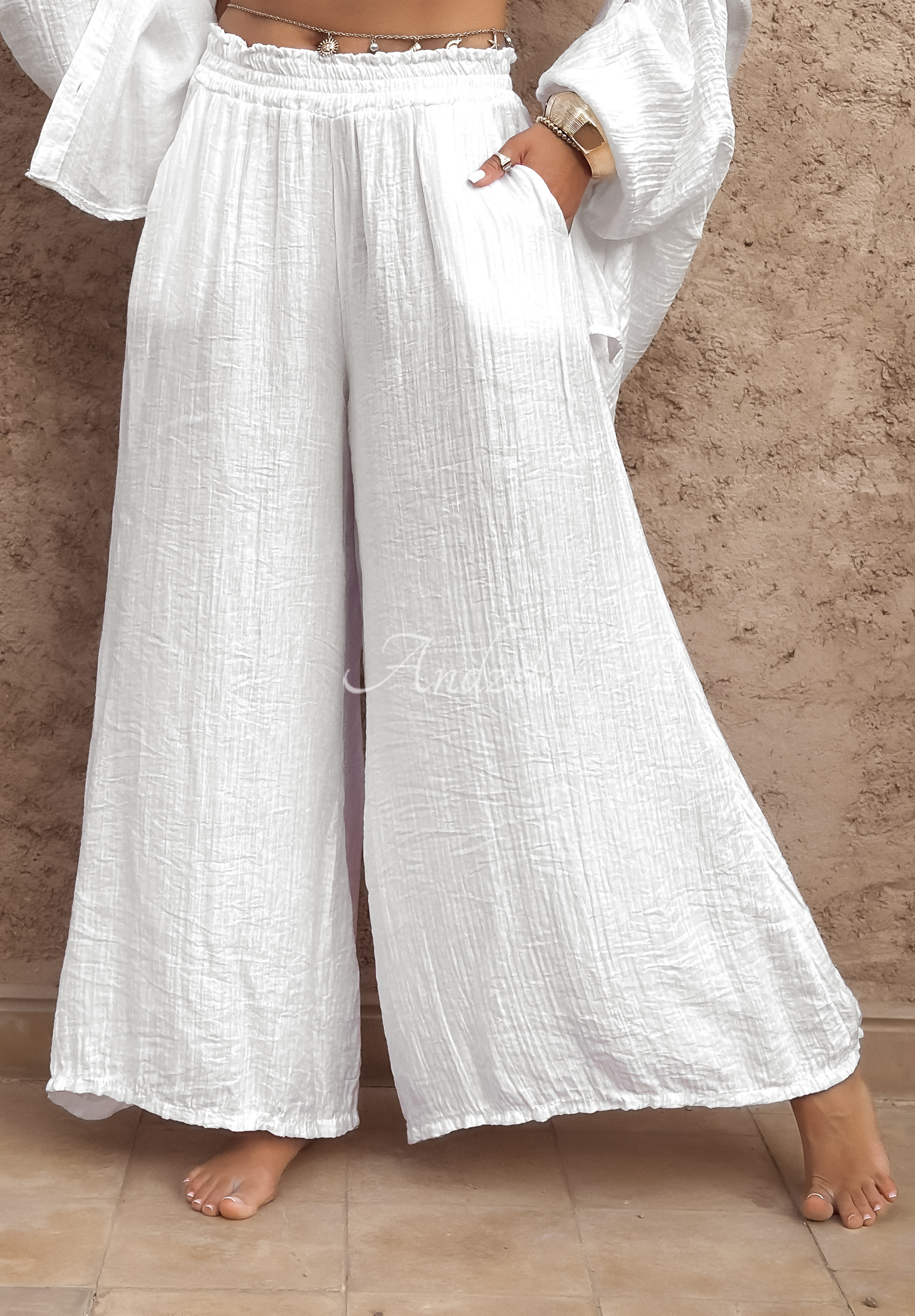 Materiałowe spodnie wykonane z lekkiej, przyjemnej w dotyku tkaniny. To model o kroju wide leg z prostą, szeroką nogawką i wysokim stanem. W pasie znajduje się elastyczna gumka, a z przodu funkcjonalne kieszenie. Całość doskonale zaprezentuje się w zestawieniu z koszulą z linii Forever Holidays.