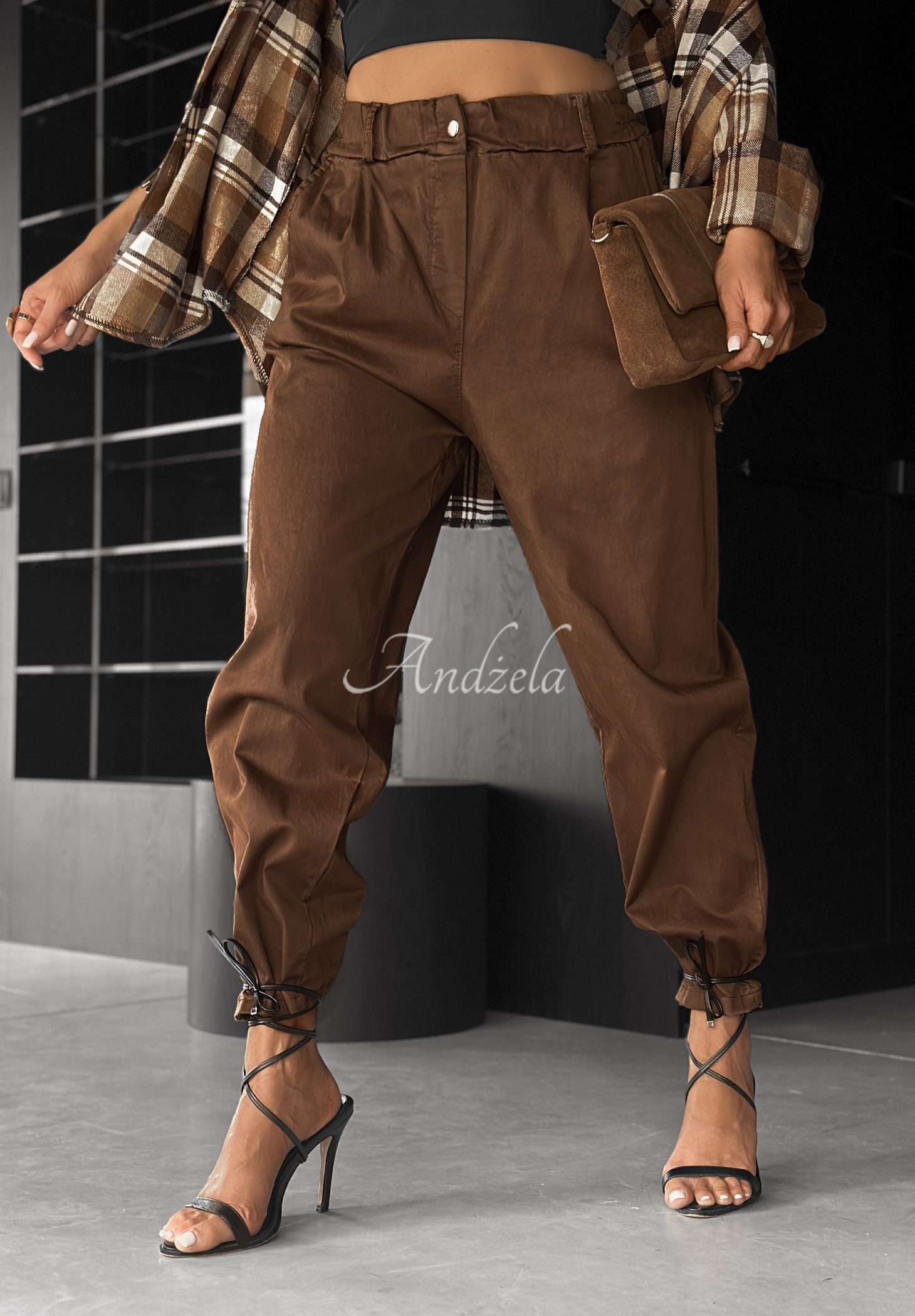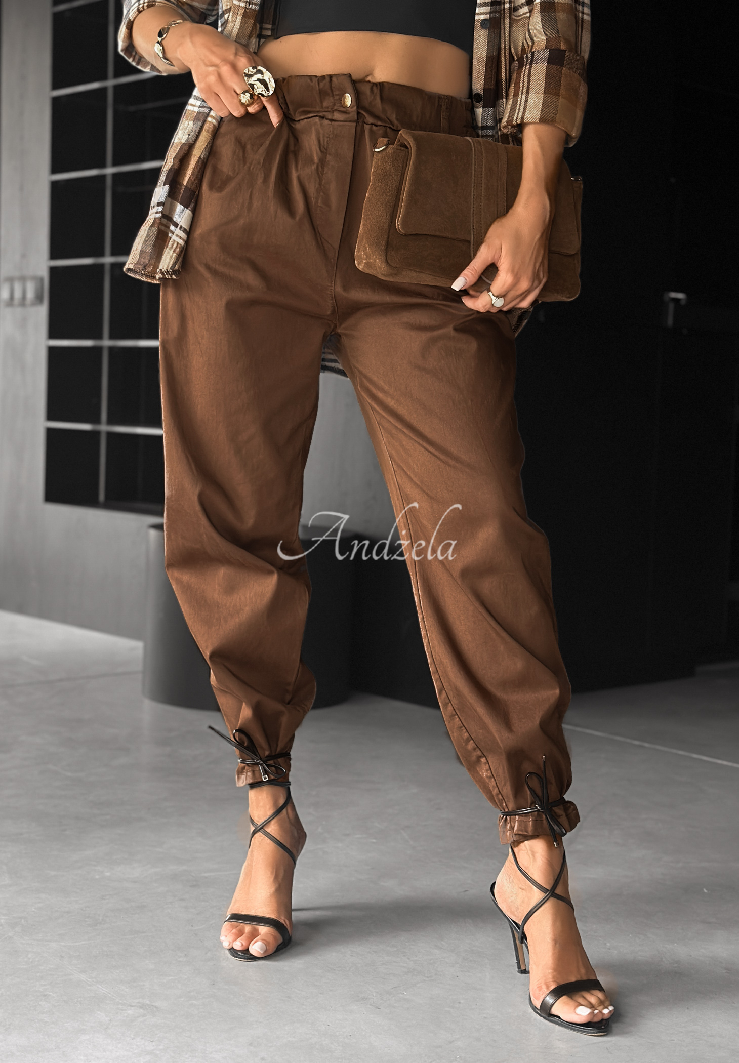 Spodnie wykonane z przyjemnego w dotyku, elastycznego materiału. To model z podwyższonym stanem, zapinany na pojedynczy, złoty guzik. Posiada