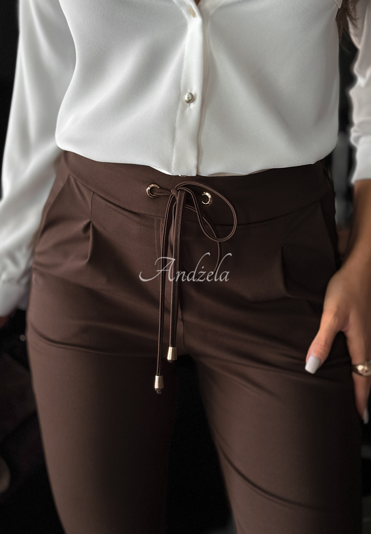 Materiałowe spodnie ze zwężanymi ku dołowi nogawkami, wykonane z dobrej jakości materiału z wiskozą. Model posiada gumkę ze ściągaczem w pasie. Z przodu znajdują się funkcjonalne kieszenie, a z tyłu ich imitacja. * materiał elastyczny* gumka w pasie ze ściągaczem i sznurowaniem* funkcjonalne kieszenie z przodu * imitacja kieszeni z tyłu* zwężane ku dołowi nogawki