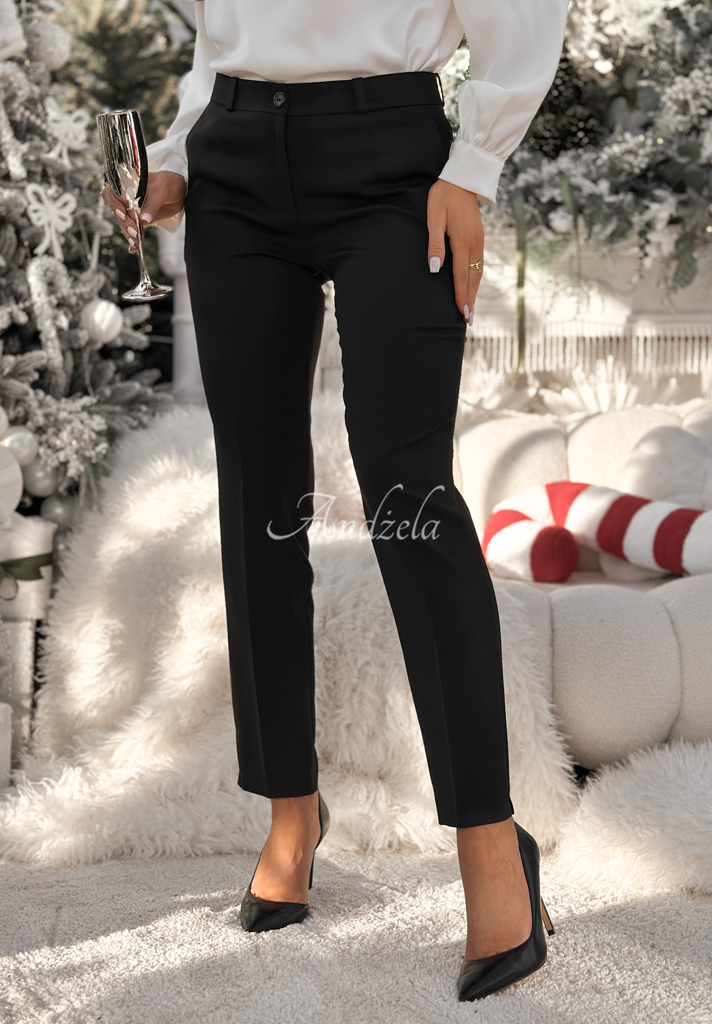 Eleganckie spodnie wykonane z wysokiej jakości wiskozowego materiału. Model o kroju cygaretek ze średnim stanem i zwężanymi nogawkami w kant. Zapinany jest na suwak i guzik, z przodu znajdują się funkcjonalne kieszenie.