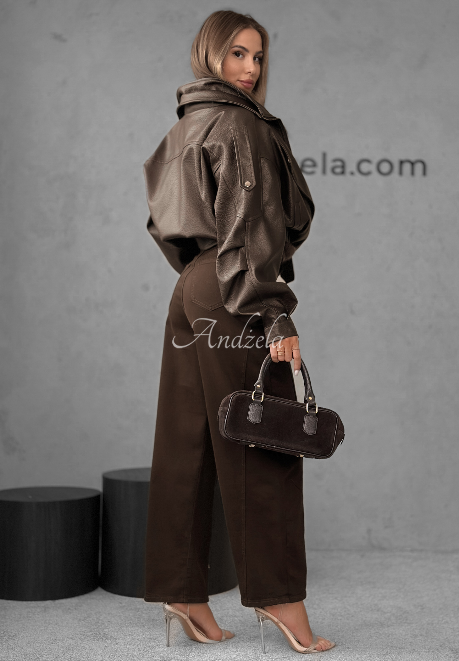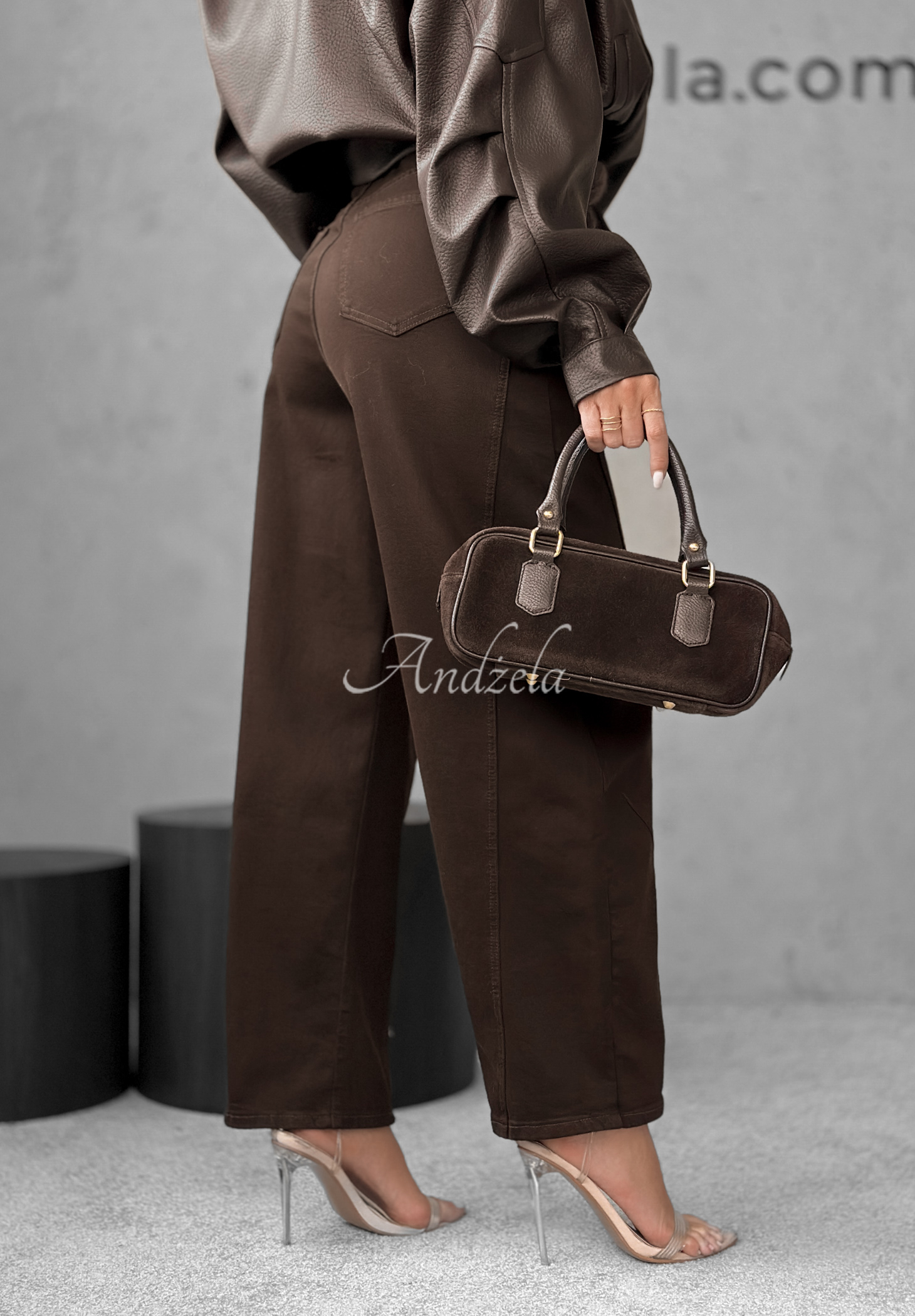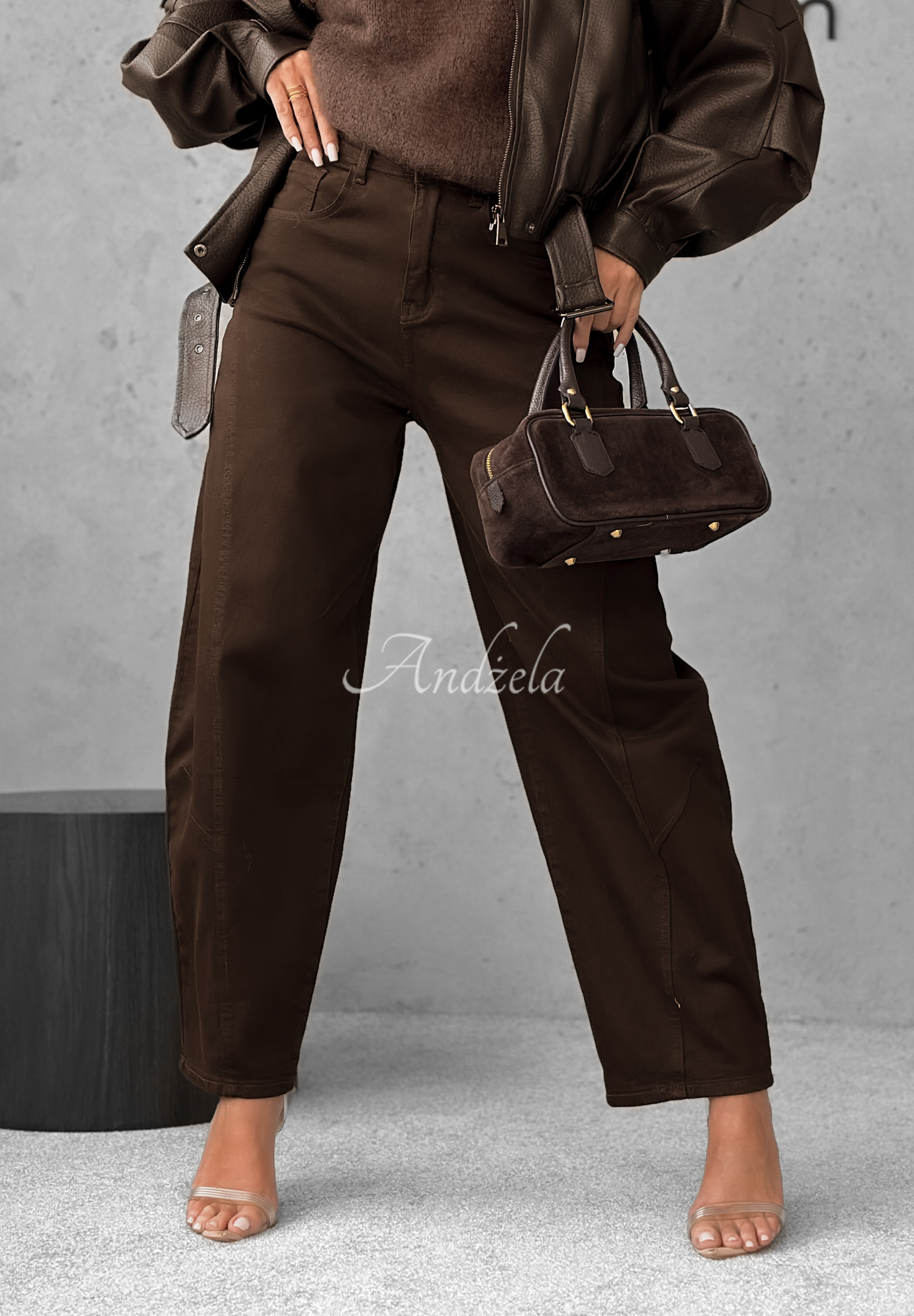 Spodnie jeansowe wykonane z elastycznej, bawełnianej tkaniny. To model o kroju balloon z wysokim stanem, posiadający szerokie, zwężane ku dołowi nogawki. Zarówno z przodu, jak i tyłu znajdują się funkcjonalne kieszenie. Zapinany jest na suwak oraz guzik.