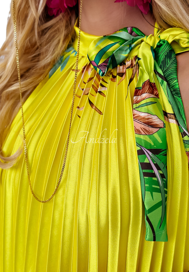 Niezwykle zjawiskowa sukienka wykonana z satynowego, plisowanego materiału, pokrytego nietuzinkowymi wzorami. To model bez rękawów z wiązaną na boku stójką. Ta propozycja fenomenalnie zaprezentuje się na różnych typach sylwetki i bez wątpienia zwróci uwagę każdego.