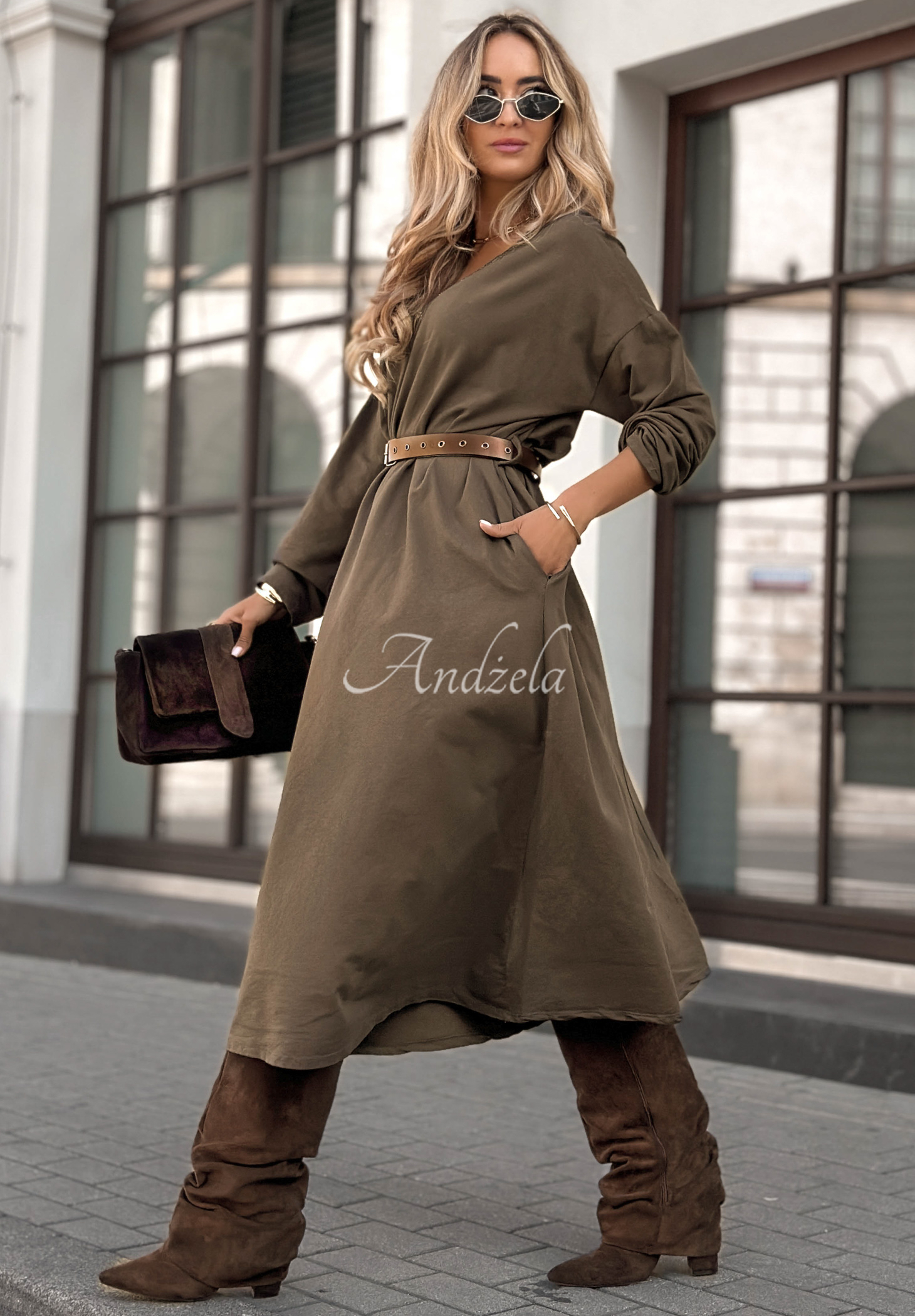 Bawełniana sukienka wykonana z elastycznego materiału to propozycja o oversizowym kroju. Wyróżnia się funkcjonalnymi kieszeniami z przodu. To model o długości midi z długimi rękawami, z przodu znajduje się kobiecy dekolt w serek, przeplatany złotą nitką. Do zestawu dołączono pasek, który doskonale podkreśla talię.