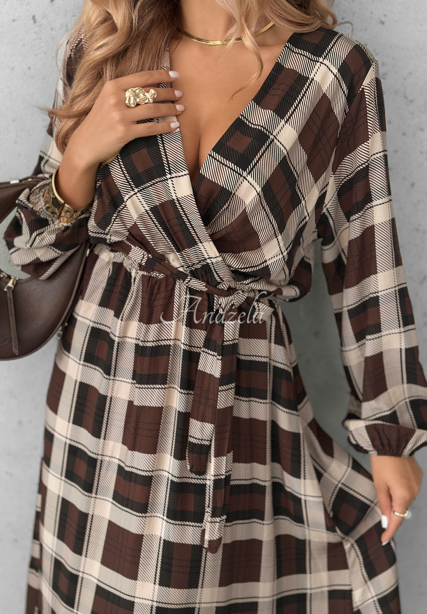 Zwiewna sukienka w kratkę, wykonana z nieelastycznego, wiskozowego materiału. To model o długości midi z kopertowym dekoltem i falbankami na dole. Posiada długie rękawy zakończone ściągaczami. W pasie znajduje się elastyczna gumka, do zestawu dołączono również pasek.
