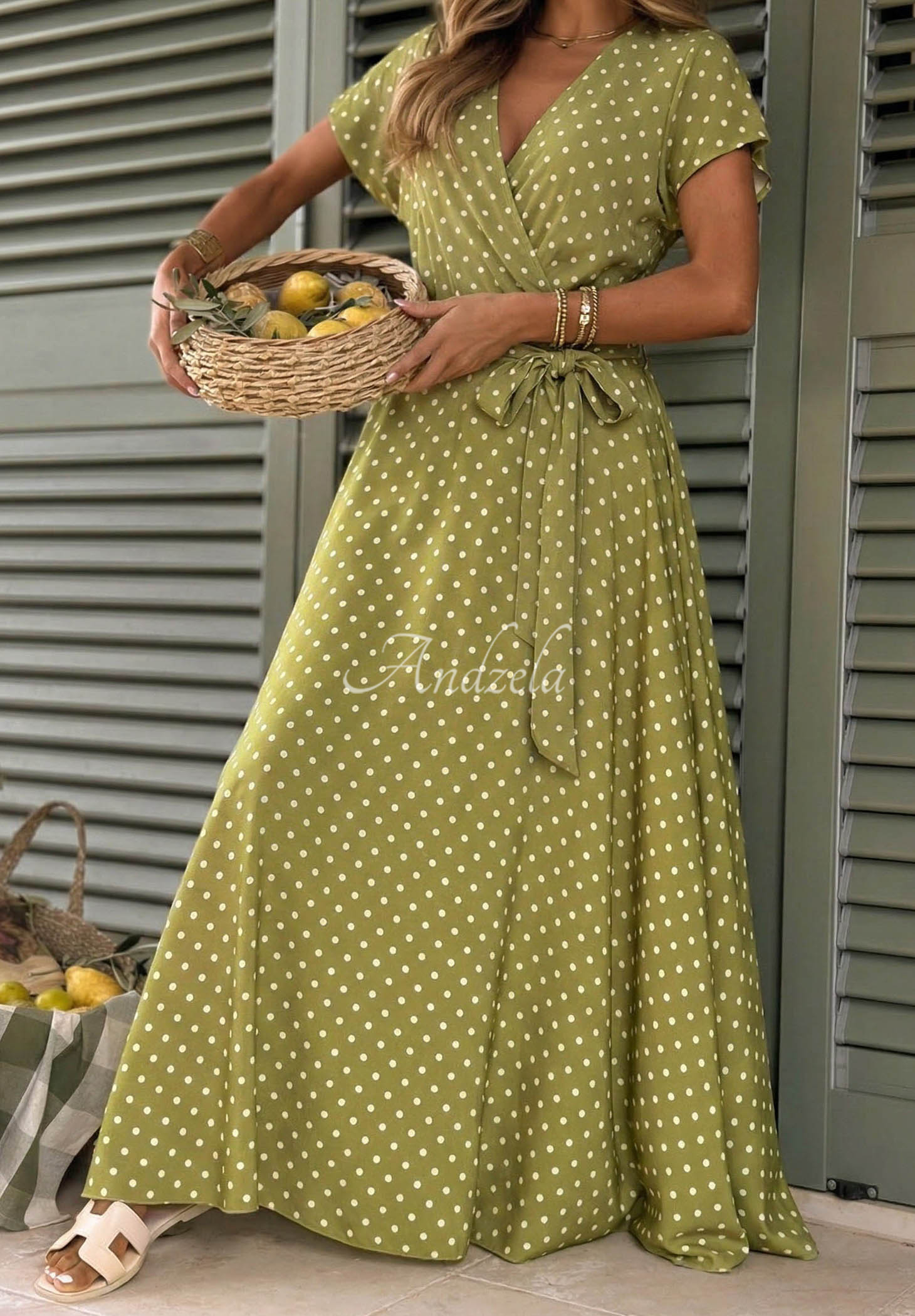 Sukienka w modny print, wykonana z lekkiej, przyjemnej w dotyku tkaniny. To propozycja z kopertowym dekoltem i kobiecym rozcięciem na dole. Posiada elastyczną gumkę w talii, do zestawu dołączono również materiałowy pasek.