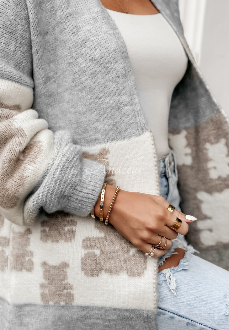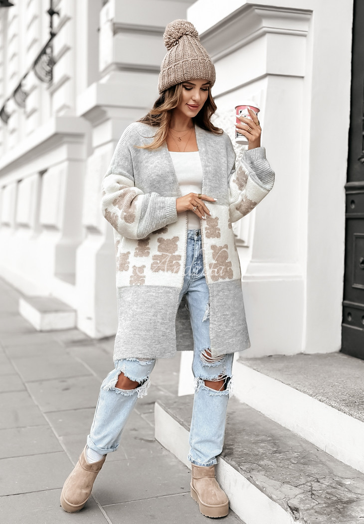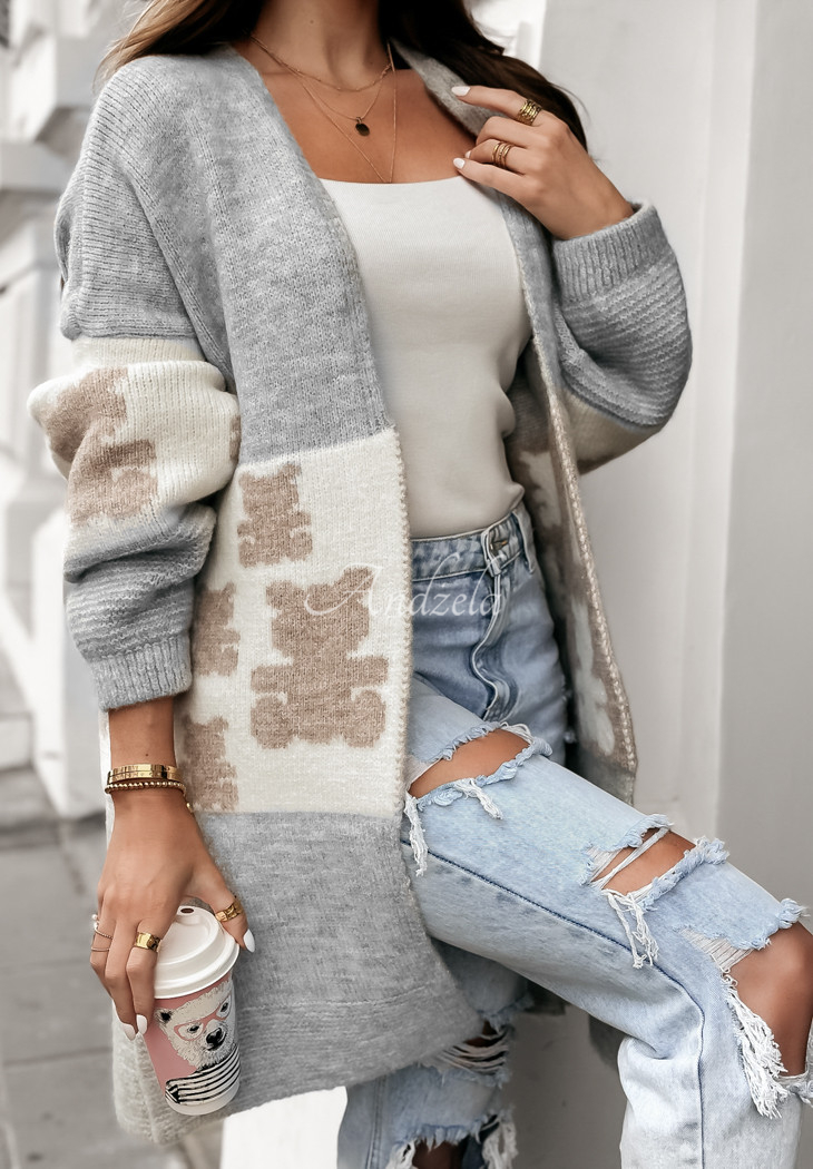 Kardigan o długim fasonie oversize z domieszką wełny to doskonały wybór na zimne dni. Wyróżnia się wzorem w misie, który nadaje całości uroku. To model ze ściągaczami znajdującymi się zarówno przy rękawach, jak i na dole.