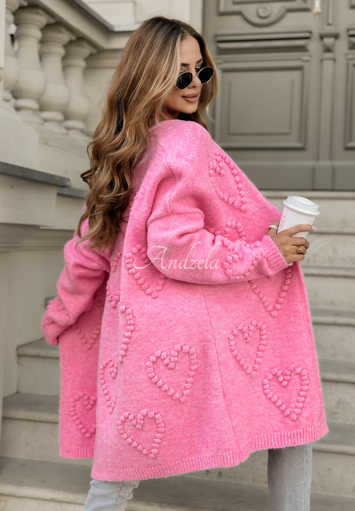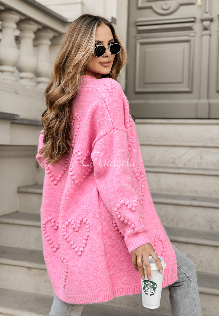 Niesamowicie dziewczęcy kardigan z domieszką wełny i ozdobnym splotem w kształcie serduszek. Prezentuje się niezwykle uroczo i idealnie sprawdzi się jako dopełnienie stylizacji na co dzień. To model o oversizowym kroju, rękawy zostały wykończone ściągaczami. Dostępny w dwóch wersjach kolorystycznych.