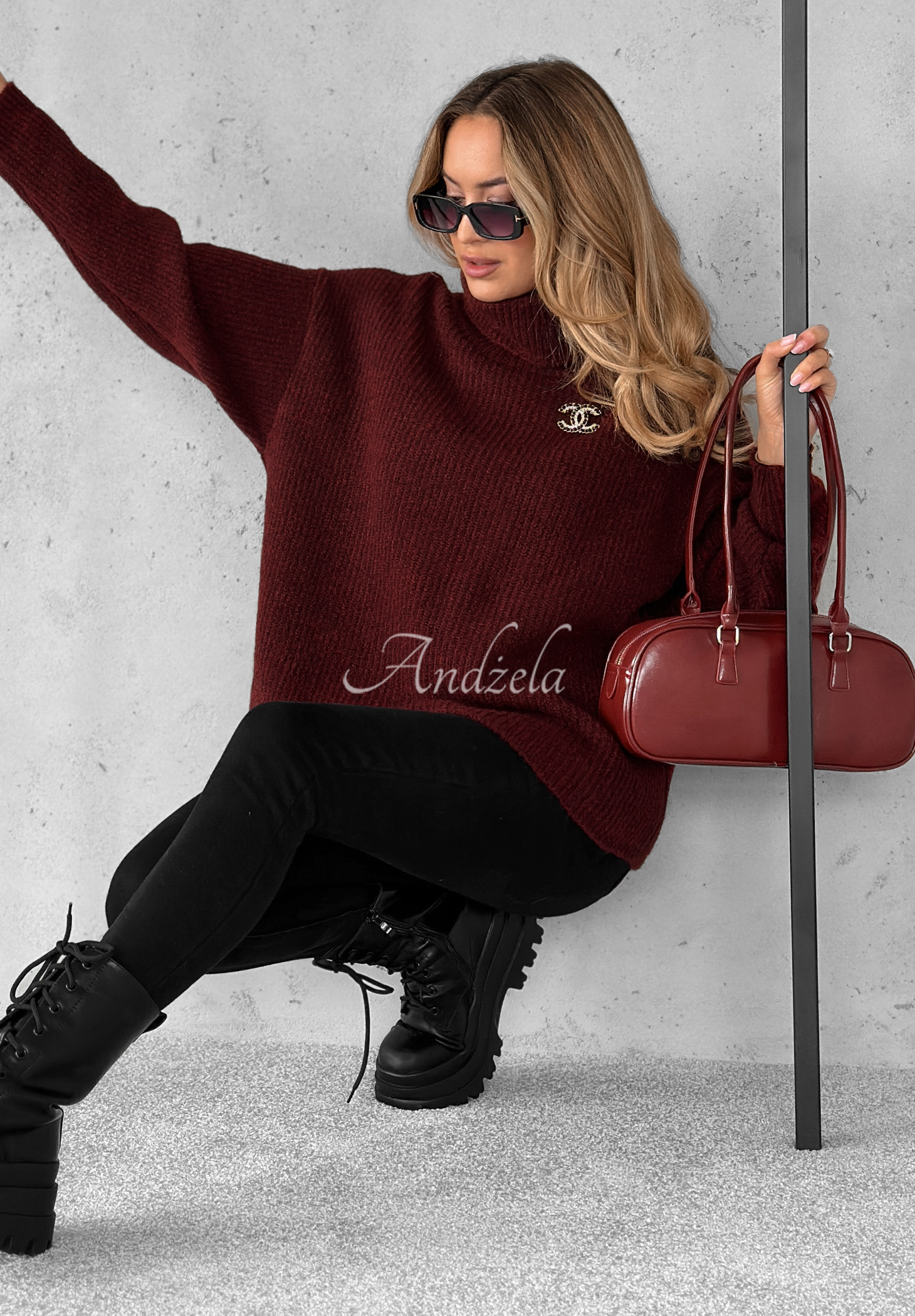 Sweter oversize z wełną Fuller burgundowy