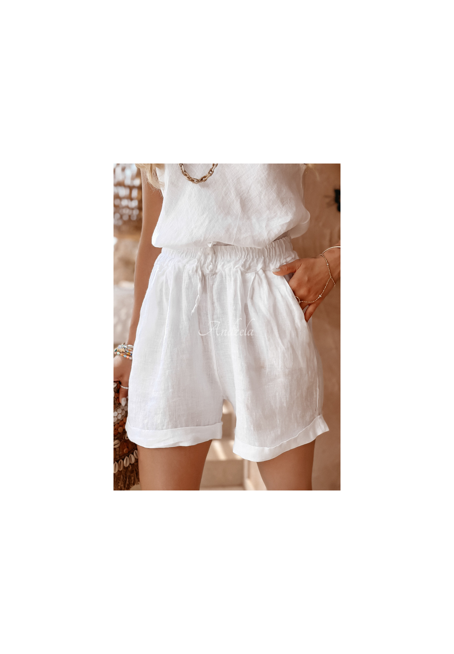 Krótkie spodenki wykonane z wysokiej jakości lnianego materiału. Posiadają gumkę ze ściągaczem w pasie, dzięki której idealnie dopasowują się do sylwetki. Z przodu znajdują się funkcjonalne kieszenie. To propozycja, która doskonale sprawdzi się w upalne, letnie dni.