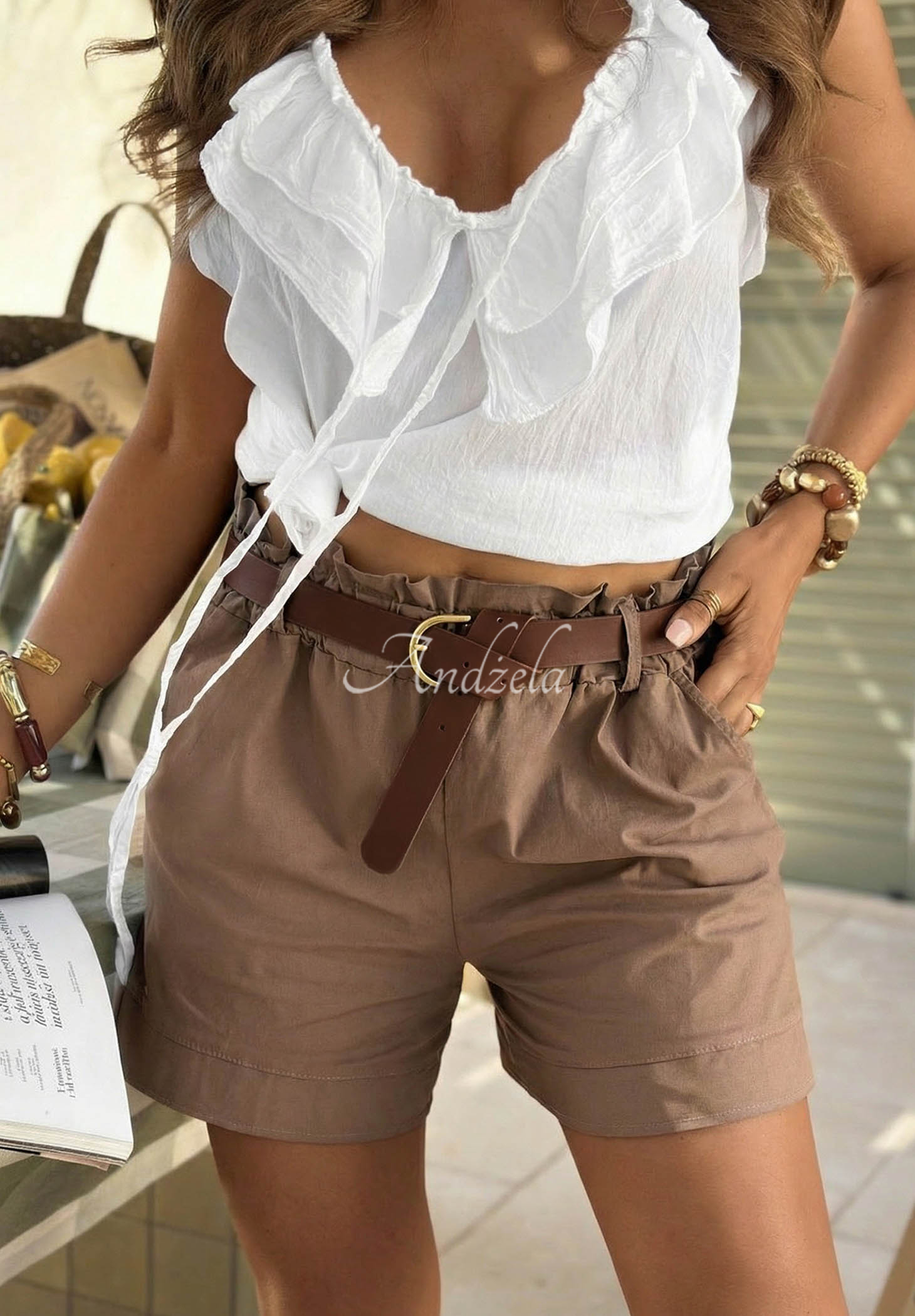 Materiałowe szorty z paskiem Any Place mokka