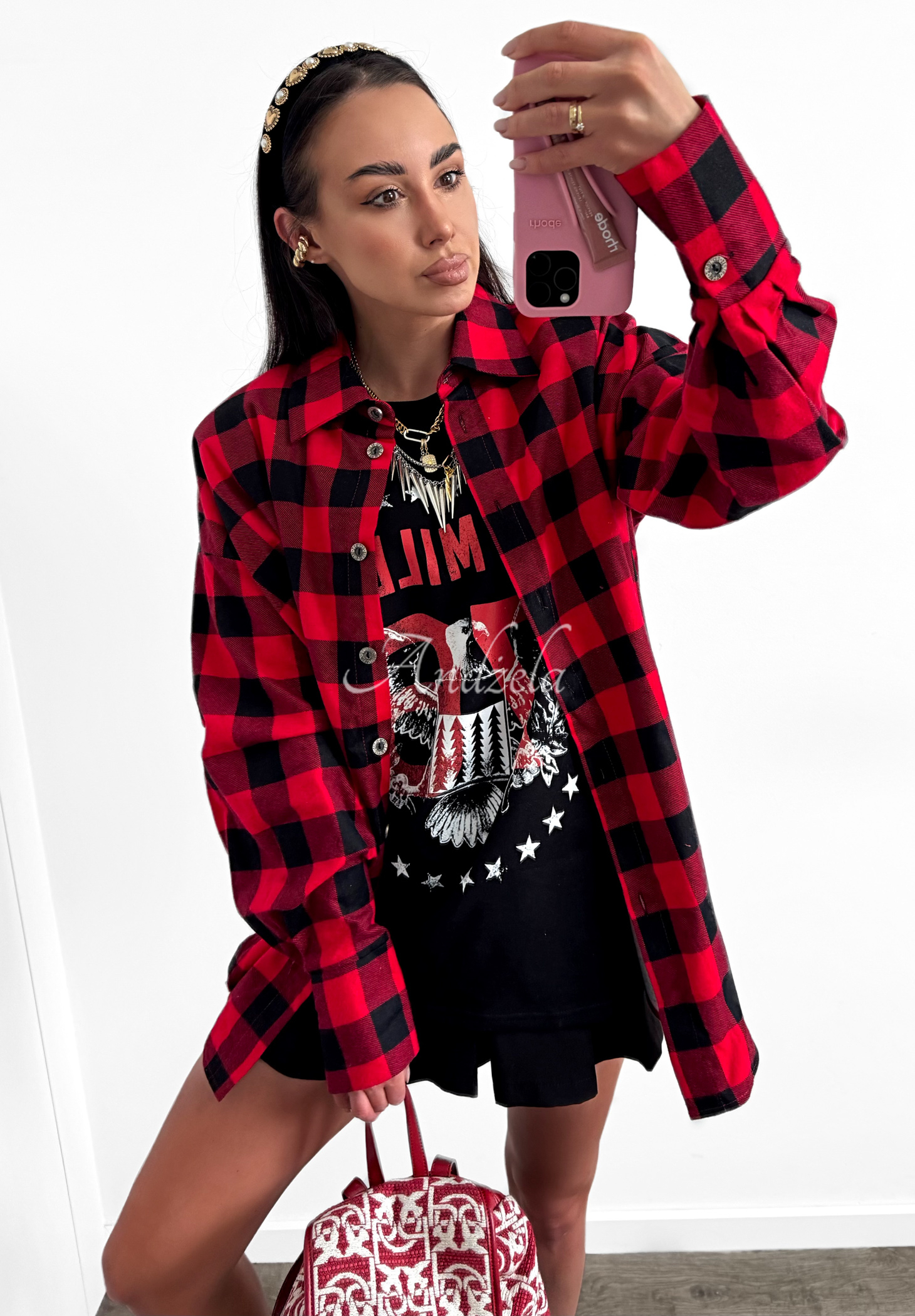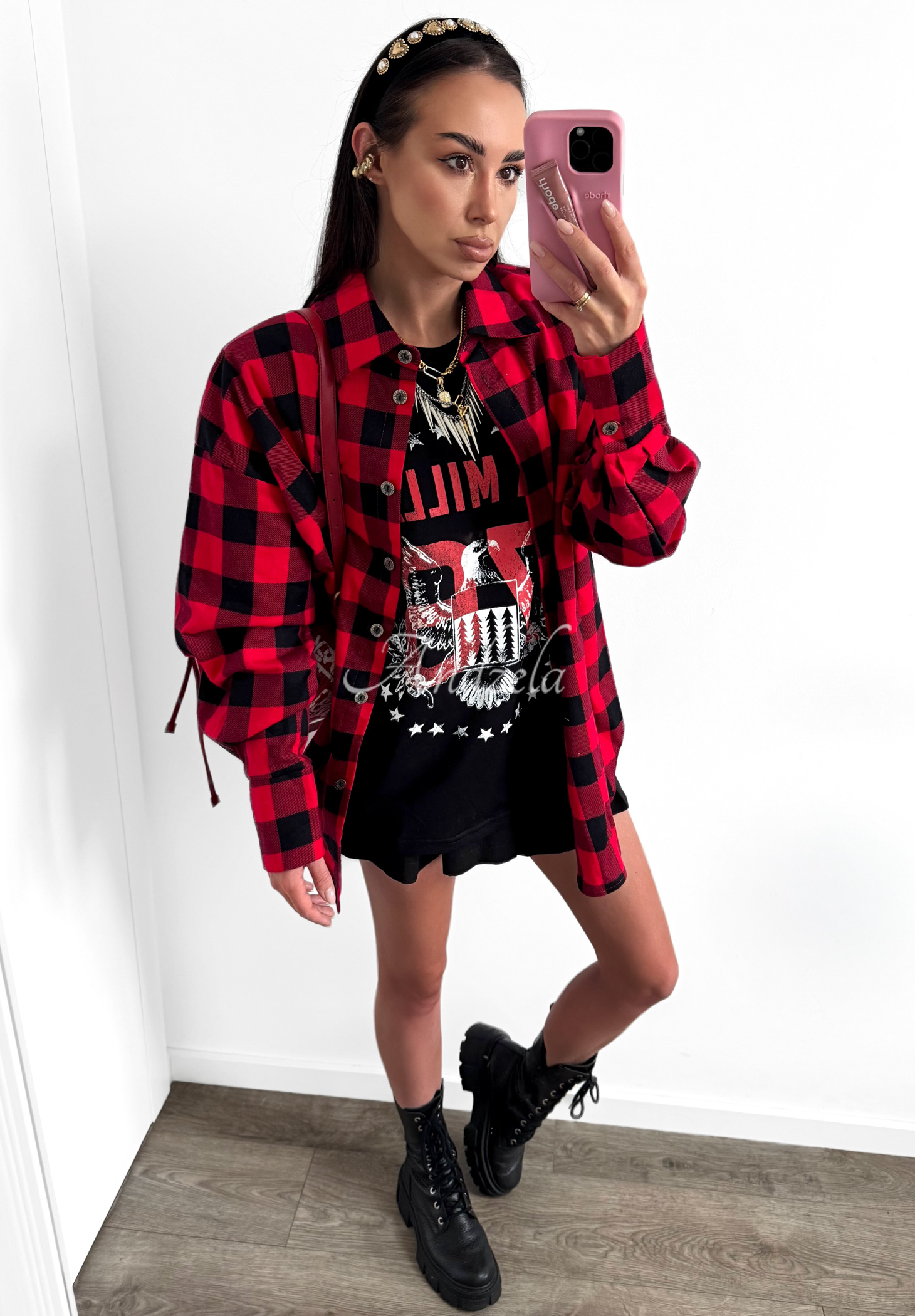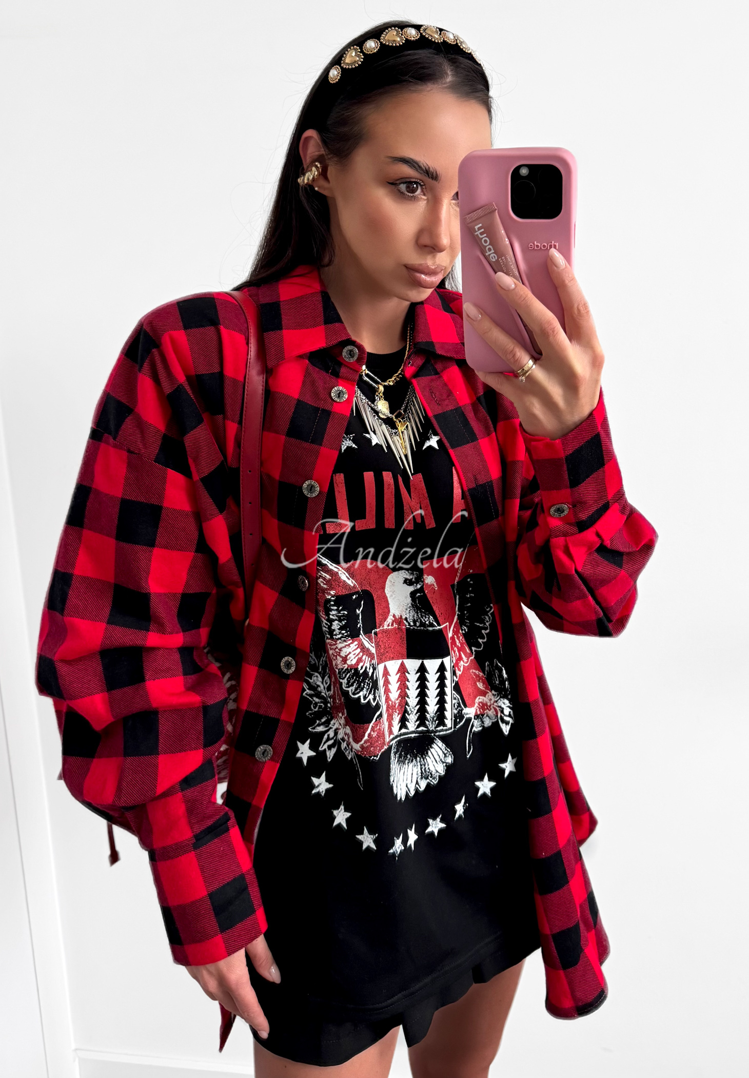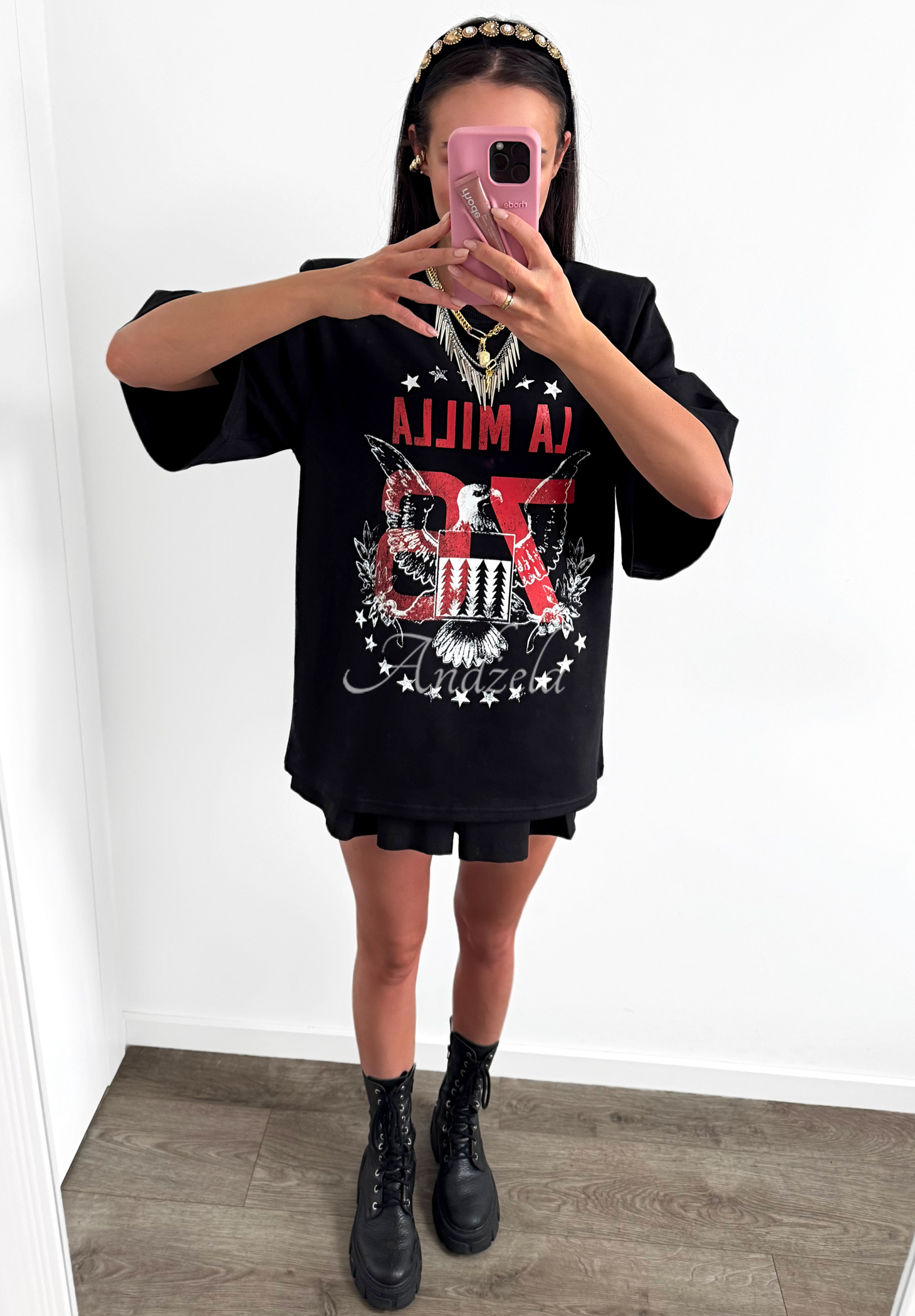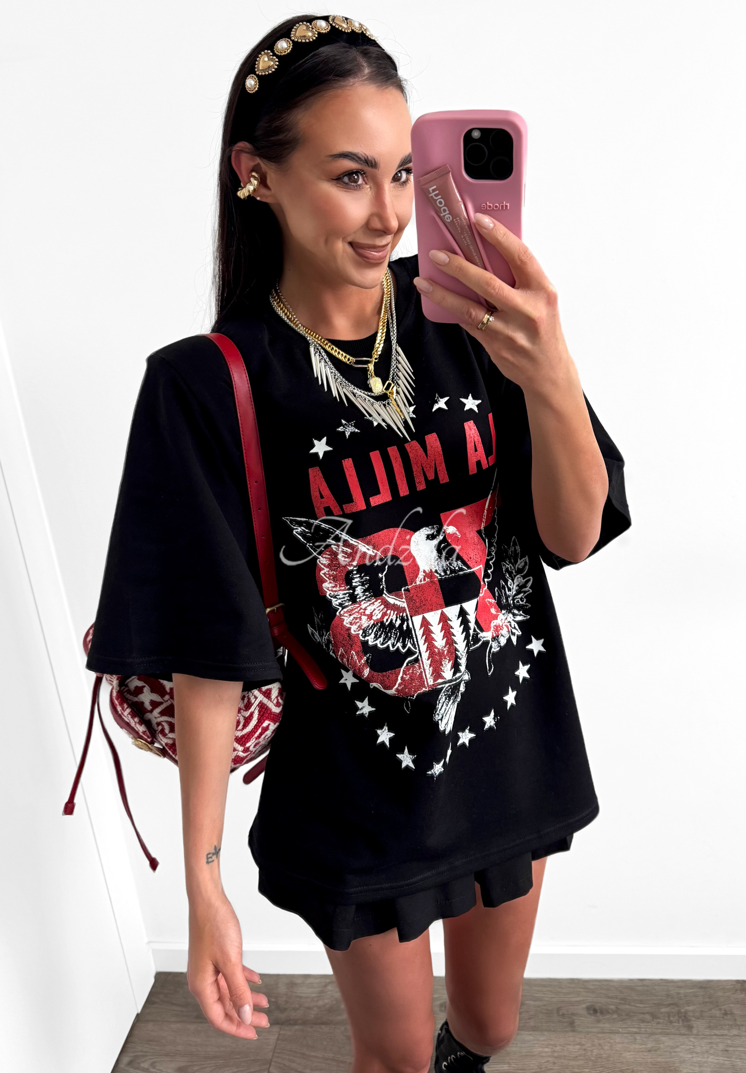 T-shirt wyróżniający się modnym nadrukiem z przodu, wykonany z przyjemnej w dotyku, elastycznej bawełny. To model o kroju oversize, który posiada zaokrąglony dekolt oraz krótkie rękawki. Na ramionach znajdują się nadające kształtu poduszki.