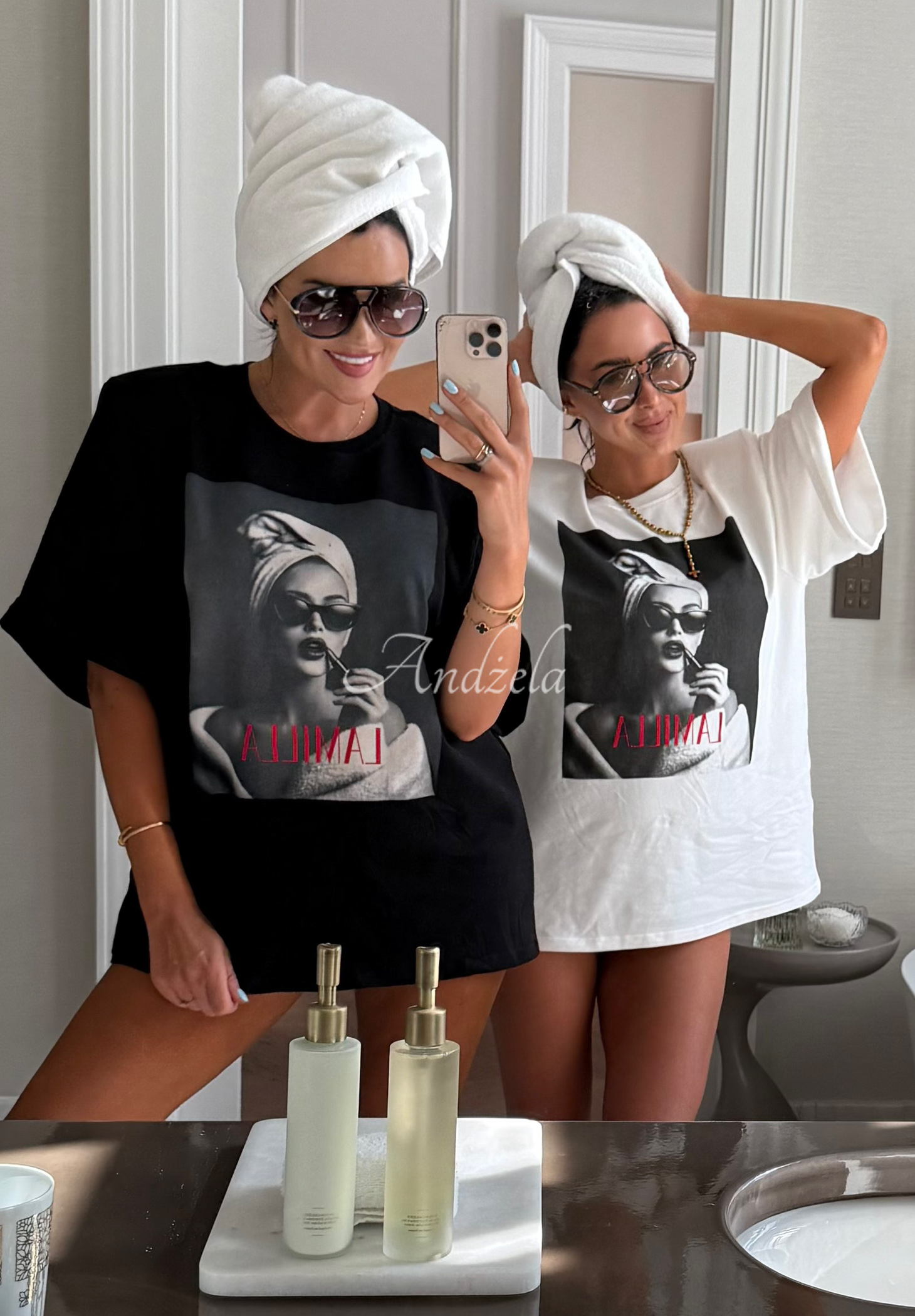T-shirt wyróżniający się modnym nadrukiem z przodu, wykonany z przyjemnej w dotyku, elastycznej bawełny. To model o kroju oversize, który posiada zaokrąglony dekolt oraz krótkie rękawki. Na ramionach znajdują się nadające kształtu poduszki.