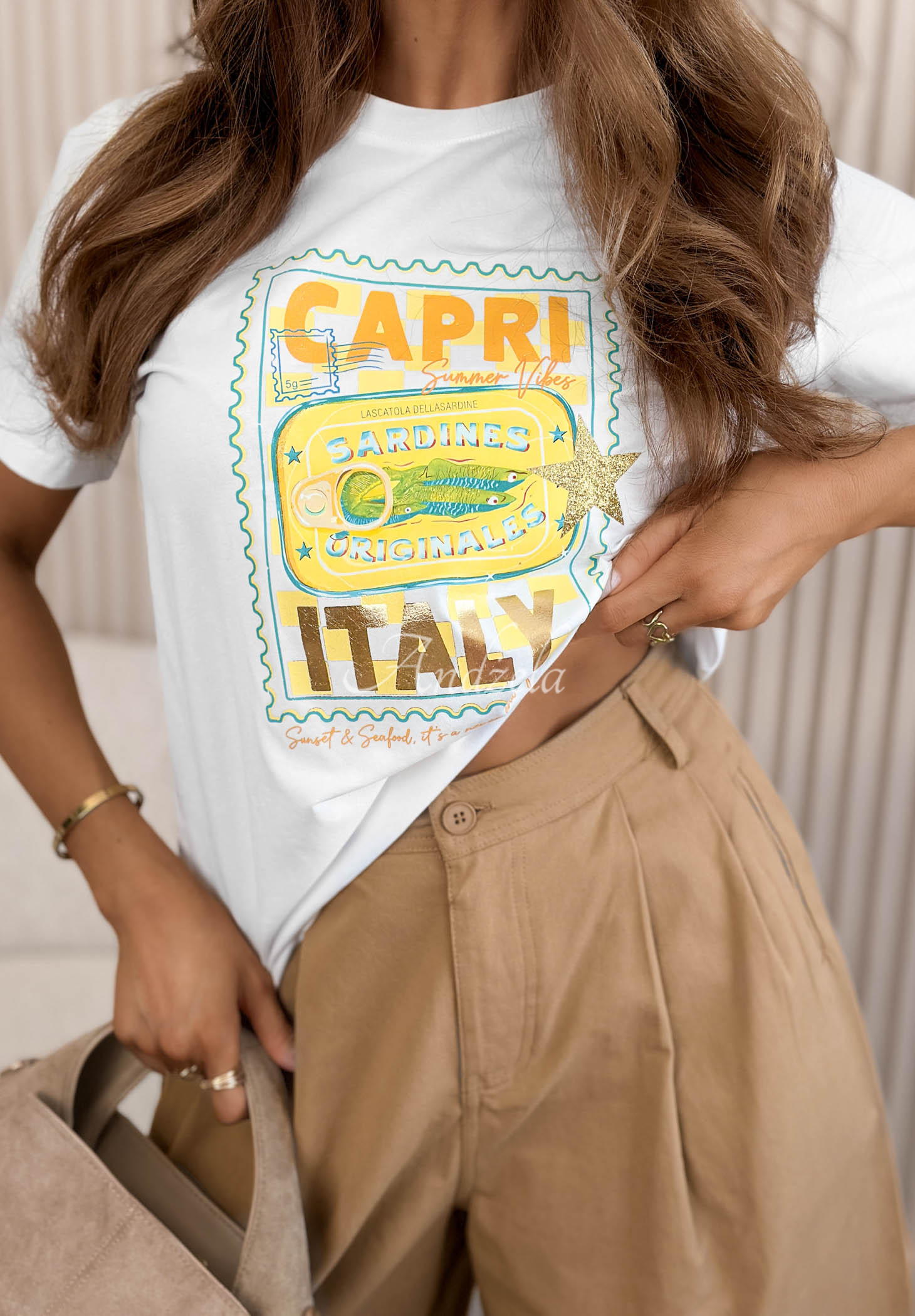 Bawełniany T-shirt z nadrukiem Capri Italy biało-żółty