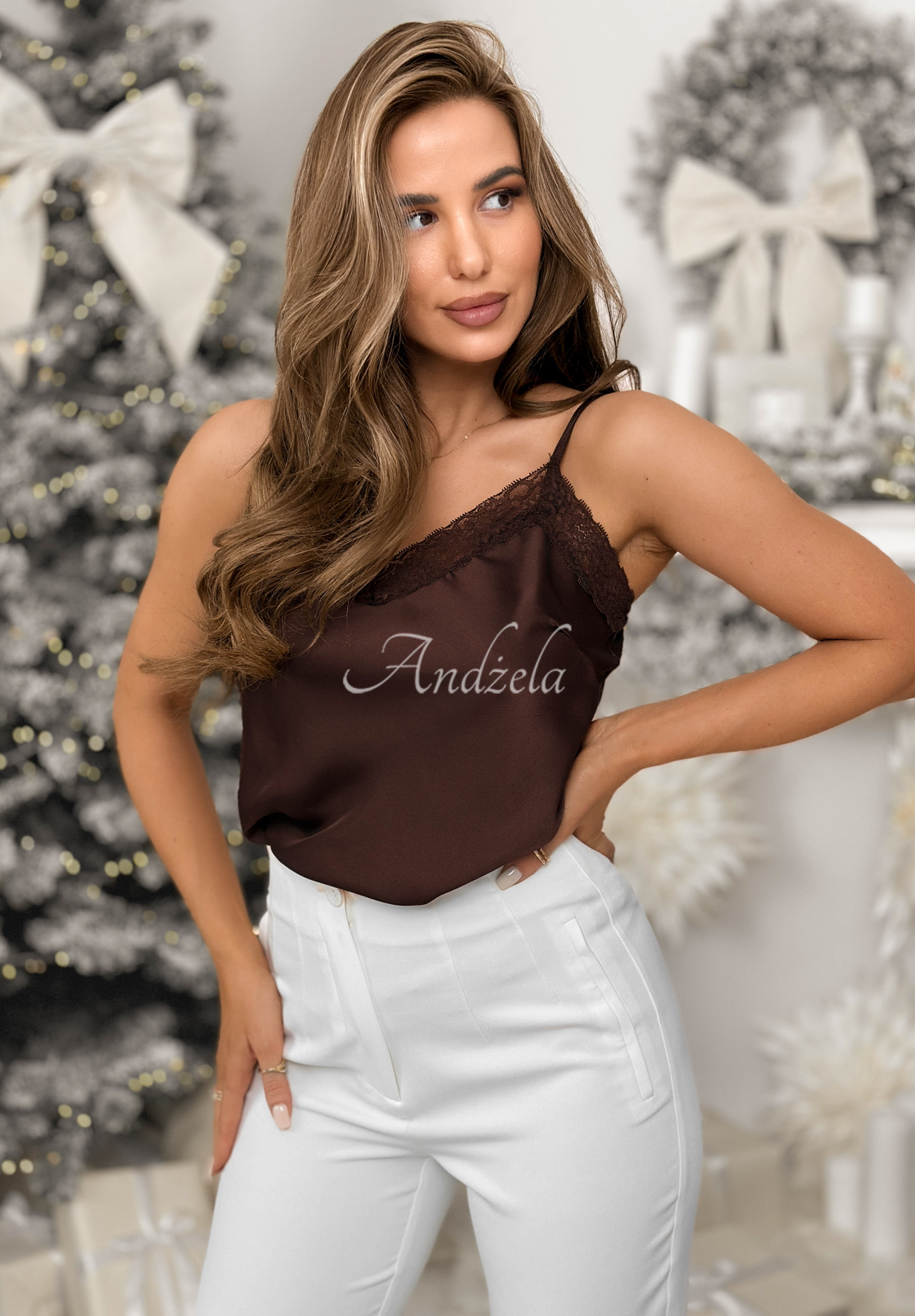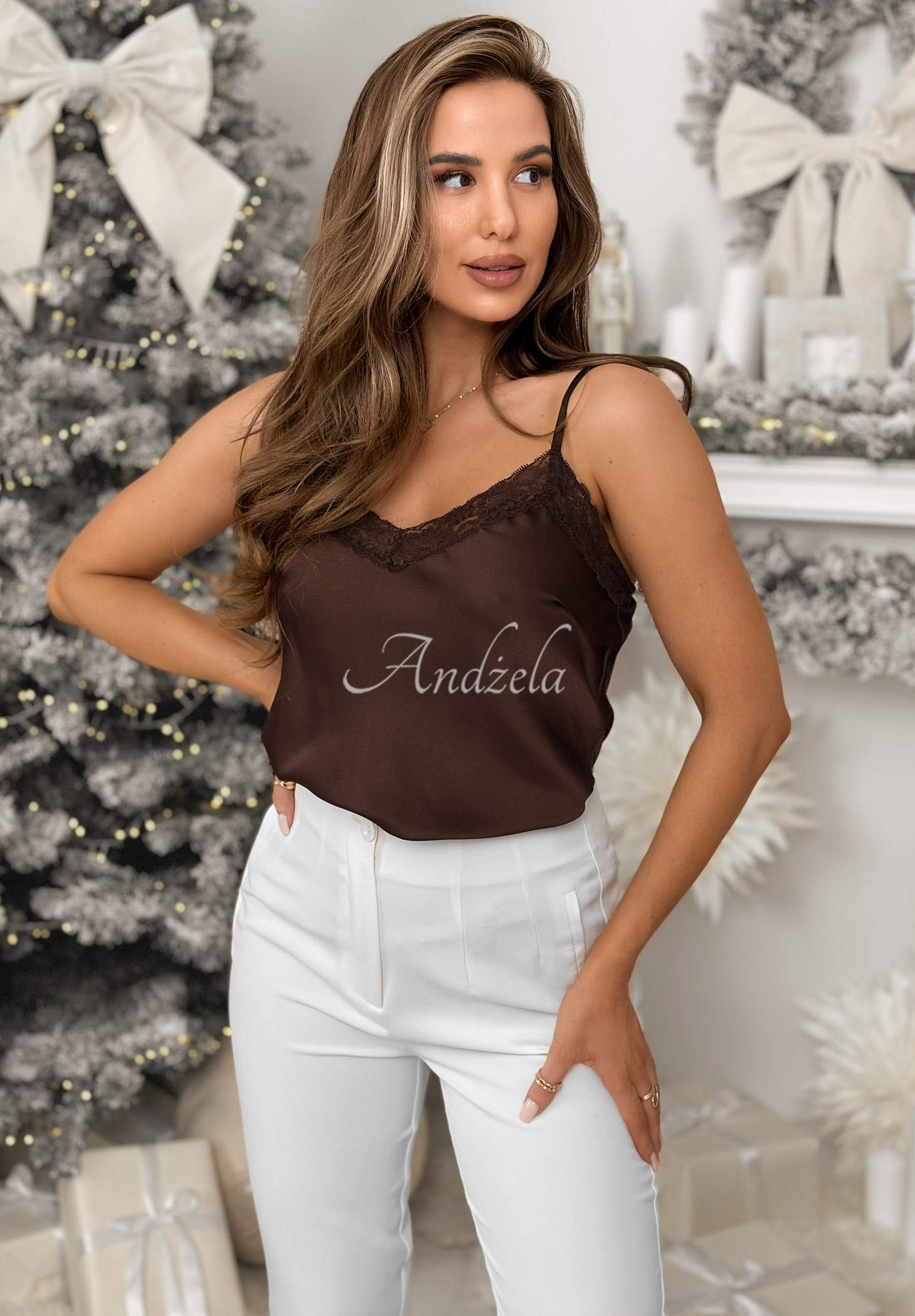 Satynowy top z dekoltem w serek to model z dodatkiem subtelnej koronki. Posiada elastyczną gumkę, która znajduje się z tyłu. * materiał nieelastyczny * dekolt w serek* koronka * regulowane ramiączka* gumka z tyłu