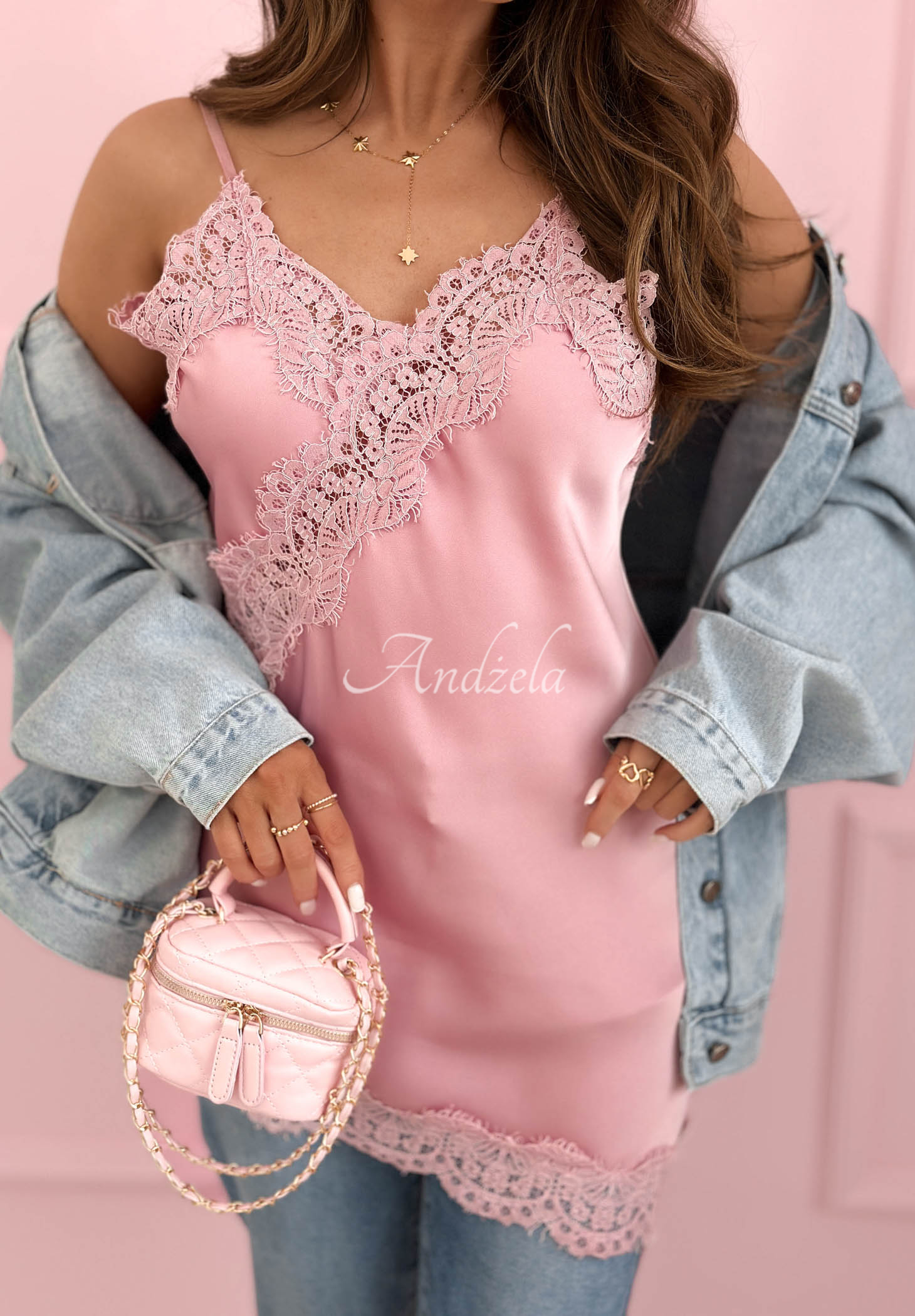 Satynowy top z koronką i asymetrycznym dołem Seductive Lace pudrowy róż