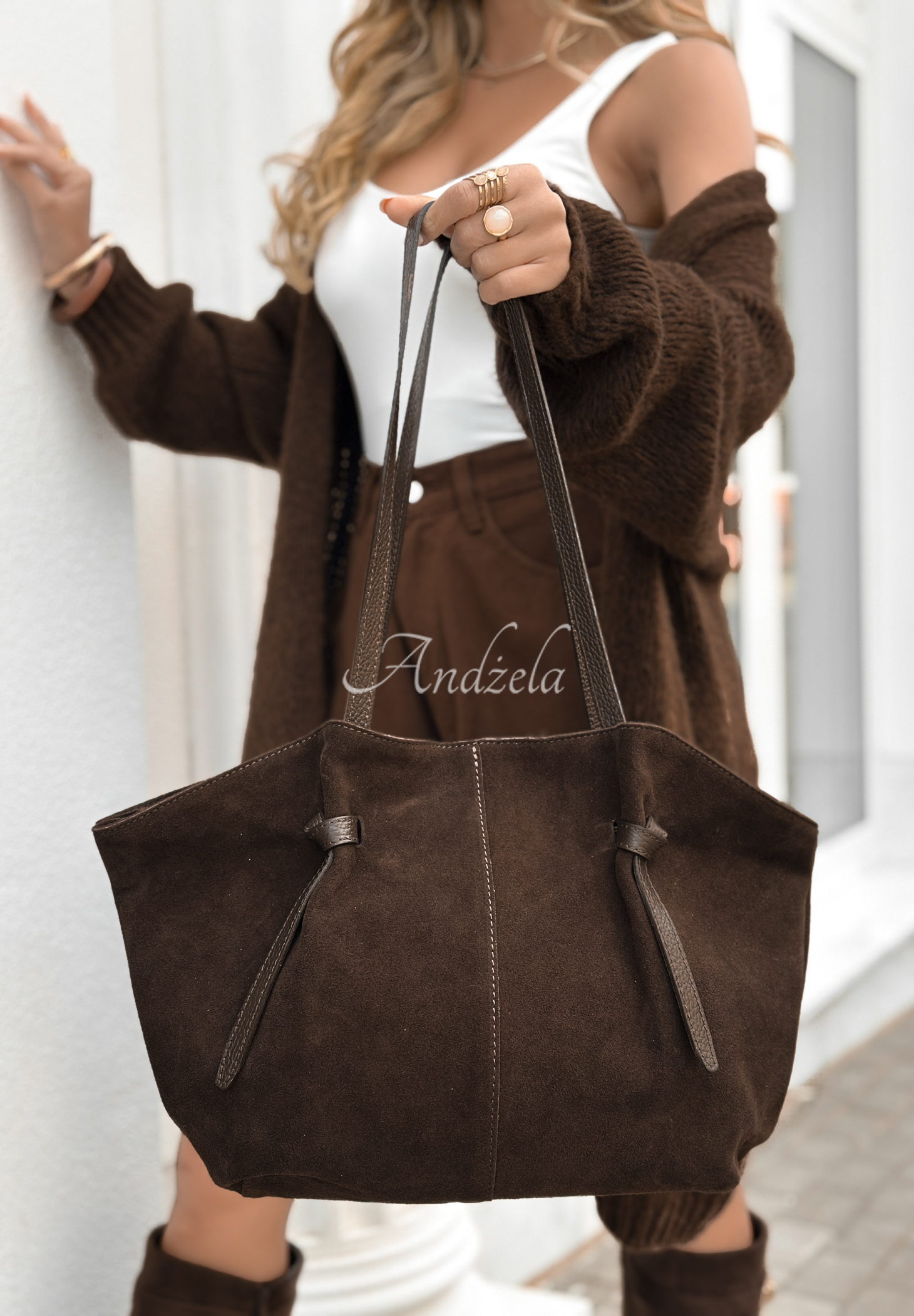 Zamszowa torebka wykonana z wysokiej jakości skóry naturalnej. To jednokomorowy model z zapięciem na suwak i funkcjonalnymi kieszonkami znajdującymi się po wewnętrznej stronie. Posiada nieodpinaną rączkę, a całość dopełniają złote detale.