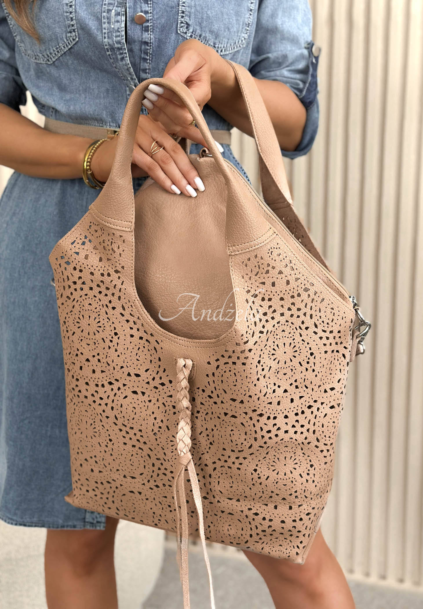 Ażurowa torebka wykonana z miękkiej skóry ekologicznej. To jednokomorowy model z zapięciem na suwak. Do kompletu dołączono funkcjonalną kosmetyczkę wraz z paskiem. Zapinana na suwak, wyposażona w dodatkowe kieszonki. Może pełnić rolę organizera, lub służyć jako oddzielna torebka.